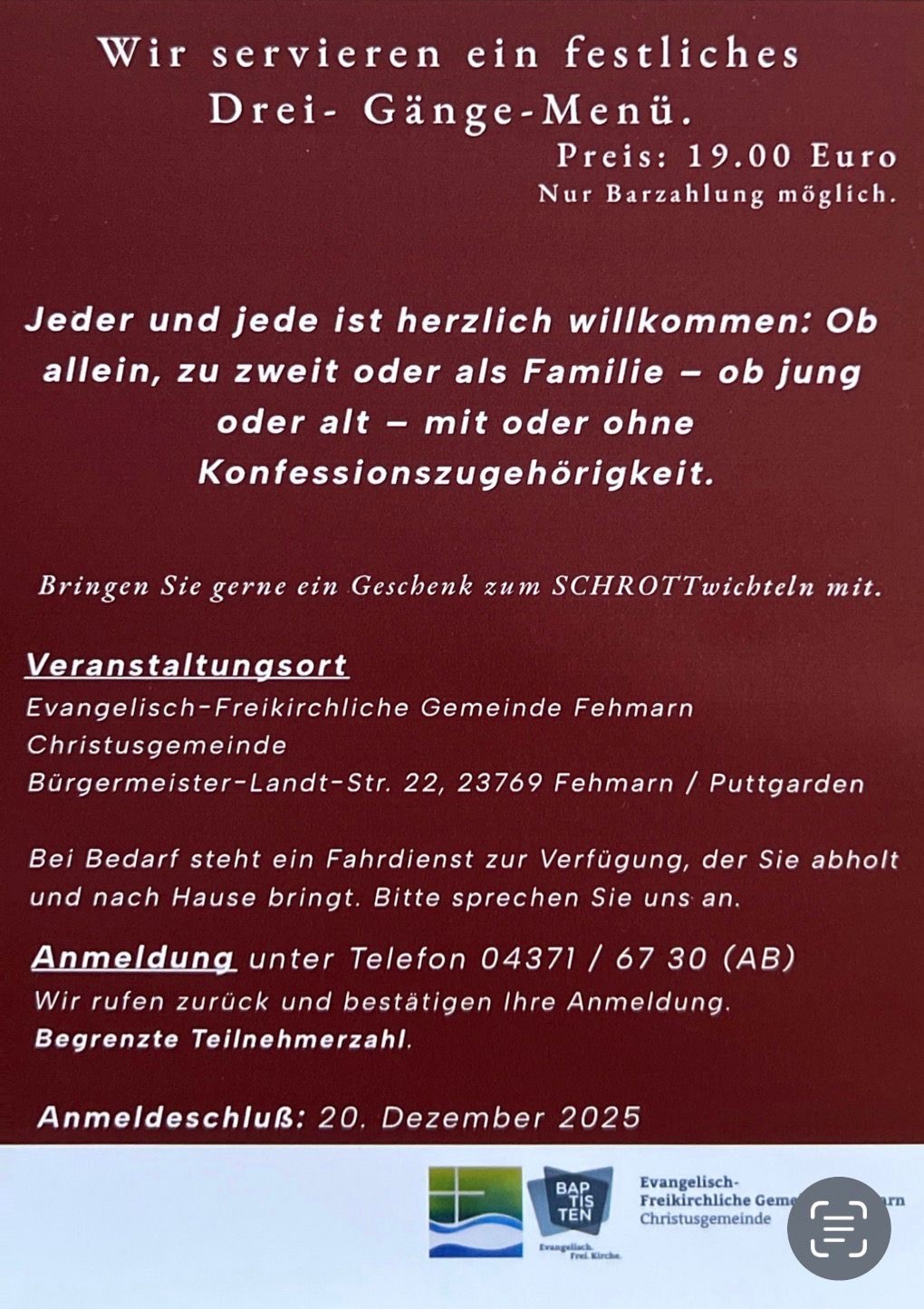 Wir wollen den Abend in Gemeinschaft zu verbringen. Wir feiern gemeinsam den Heiligabend. Familien, die den Herd mal schonen möchten sind genauso eingeladen, wie auch Menschen, die den Heiligabend nicht alleine verbringen möchten. Fragen hierzu oder die Anmelden kann man sich unter 04371 / 67 30. Für das Menü und die Getränke erbitten wir eine Kostenbeteiligiung von 19€ pro Person.